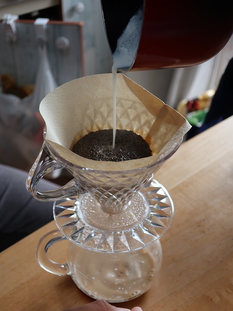 濃くなることを期待してその牛乳を再度ドリッパーへ。