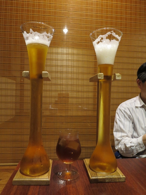 途中が細くなっているので、見た目のインパクトほどには量は多くないのだと思いますが、中ジョッキ2杯くらい入るのかな。