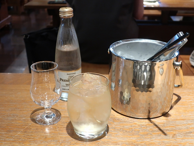 美しいロックアイスがごっそり詰まれたアイスペールが一人一個配られたなと思ったら、「山崎の天然水で作ったソーダ」とかいう高そうな瓶入り炭酸水も配られて(こんな商品見たことないぞ)、オシャレなロックグラスで自分で作っていきます。