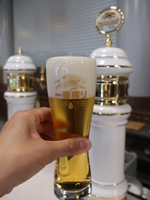 サーバーカウンターが並ぶオシャレな会議室みたいな部屋で、ここでもまずは駆け込み一杯の一番搾りをグラスでいただきます。