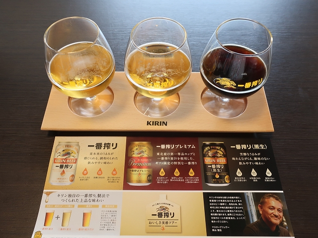 グラス一杯飲んだ後に、「一番搾り」「一番搾りプレミアム」「一番搾り黒生」の100ccずつの飲み比べがあります。
