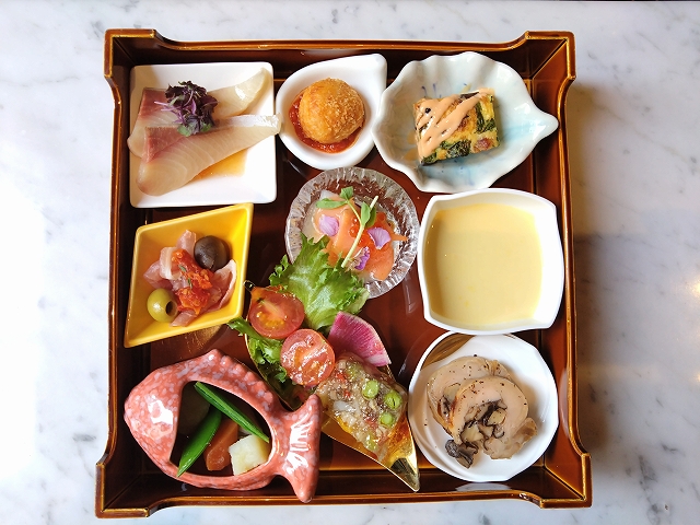 (和食のような盛り付けだったのに、カトラリーに箸が入っていなかったのはどうかと思いますが。)