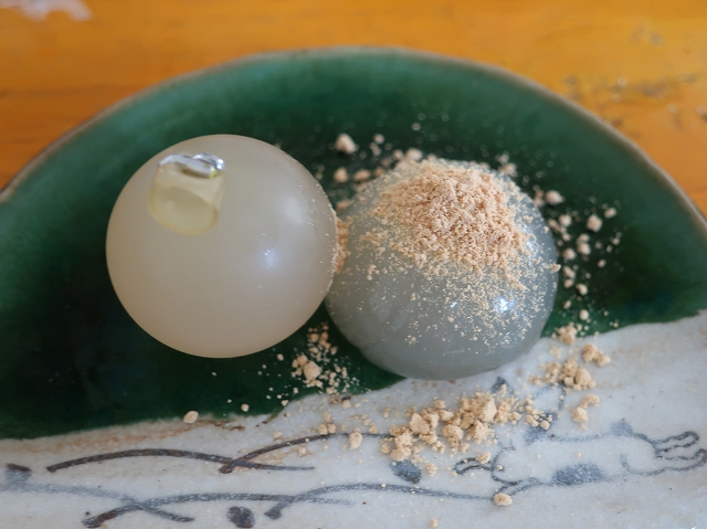出てきたのは羊羹よりもっちりとした感じのわらび餅風のもので、まん丸だったのがちょっと平たく潰れるのも可愛い。