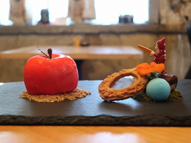 メニューの写真になかったチャコール紙が皿に掛けられているなと思ったら、運んできてくれたスタッフが「それでは毒リンゴを希望のリンゴに変える魔法を掛けます」だったかなんだったかの声とともに紙に火をつけ、広がる炎とともに瞬く間に紙が焼け落ちて、中から赤いリンゴのアイスムースが!