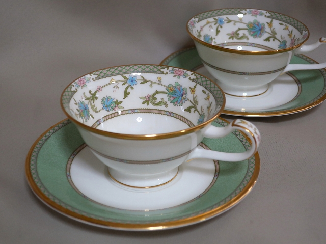 ノリタケ製、白磁、金縁、東洋風デザイン、共柄のソーサー、どこを切り取っても伝統的な正統派の高級品です。