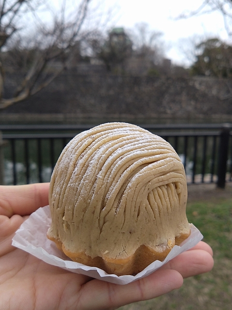 さて甘いものが食べたかったので、使い捨てフォークも併せて買って、お隣の大阪城が見える位置まで歩いて、外で食べることにしました。