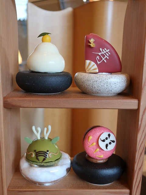 お正月モチーフをそのままかたどったスイーツ類がめっちゃ可愛い。鏡餅に扇子に今年の干支に達磨です。