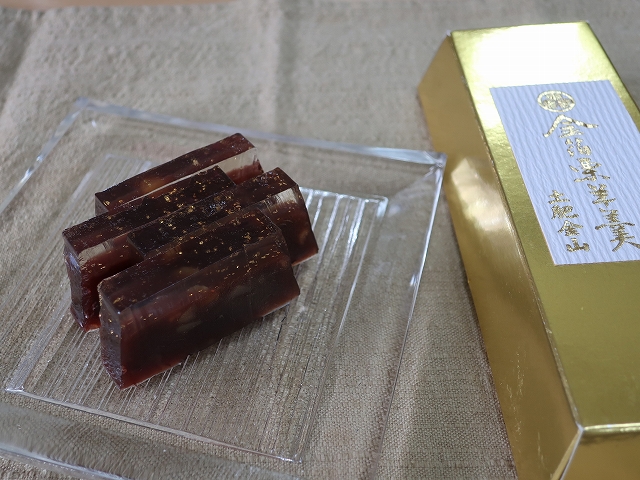 金箔が散らしてある華やかな一品ですが、よく見るとベースが羊羹、上段は寒天となっており、透明な寒天の中にキラキラとした金箔が透けて見えるようになっている手の込んだ幻想的な意匠。
