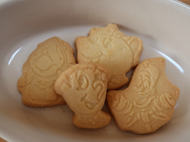 中には4種類のデザインのクッキーがあり、上記2キャラと時計のキャラ(コグスワースというらしい)、ロウソクのキャラ(ルミエールというらしい)がかたどってあります。