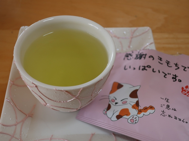 パッケージに「感謝の気持ちでいっぱいです」とか何だか可愛い一言が書かれた緑茶ティーバッグ。