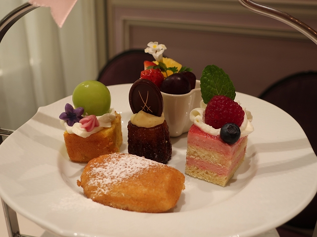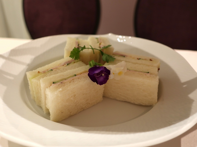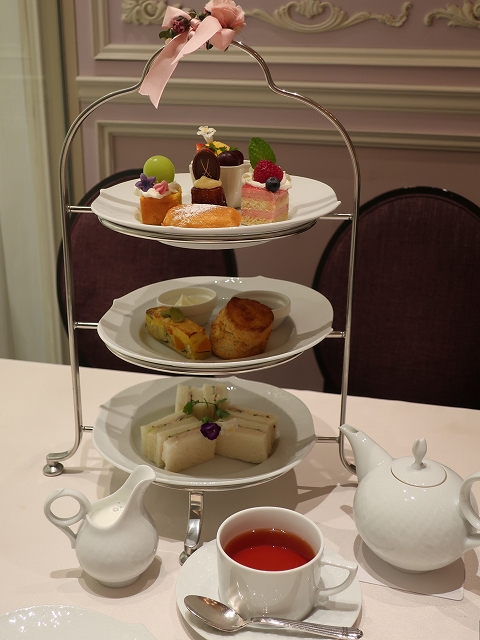フードは下からハムとキュウリのサンドイッチ、スコーン、スイーツと正統な内容。