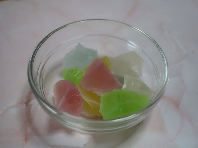 いわゆる琥珀糖ですね。去年か一昨年、私が手作りしようとして失敗したやつ。