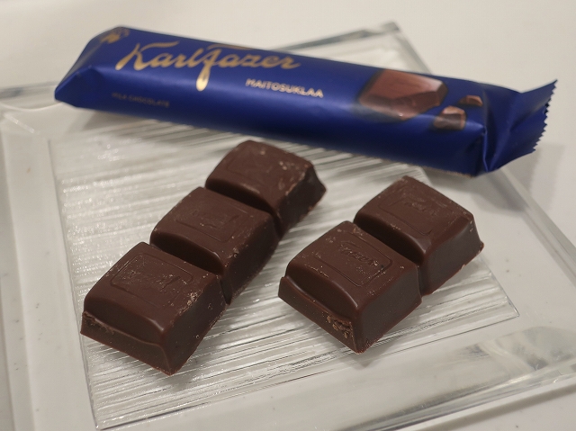海外っぽい質感のフィルム包装されたチョコバーは、ファッツェルというフィンランドのメーカーの模様。
