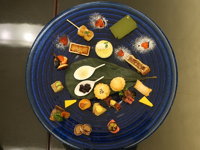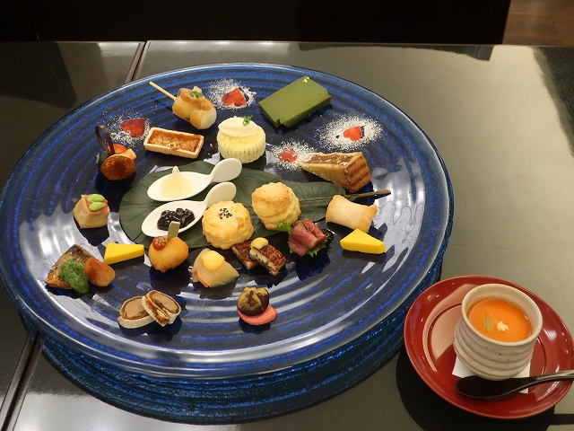 あれ?インスタで見た限りでは黒いツヤのある大きな円盤にフードを盛り付け、その中央にティースタンドを立ててスイーツを配するという高さと奥行きのある美しい和のセッティングだったはずなんだけど?え、大皿・・・??